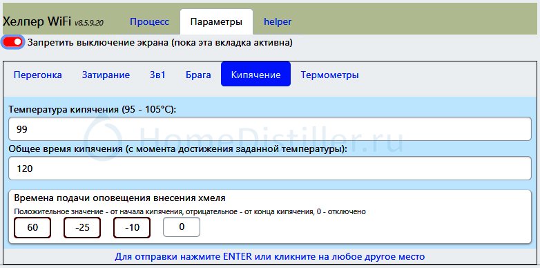 4. Включение дополнительного, разгонного ТЭНа любой мощности при разогреве содержимого ПВК или Куба в режимах автоматики – «Разогрев», «Спирт Авто 3в1» и «Затирание солода». Включать ТЭН нужно непосредственно в сетевую розетку, мимо автоматика Хелпер Wi-Fi, а выключать по звуковому сигналу автоматики.