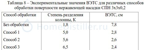 В таблице 8 приведены экспериментальные значения ВЭТС, полученные при разделении изотопов водорода методом ректификации воды природного изотопного состава с использованием нержавеющей насадки СПН 3х3х0,2 при давлении 0,2 атм и нагрузке, составляющей 0,8 от предельной. Также приведено значение ВЭТС, полученное на необработанной насадке с обезжиренной поверхностью.