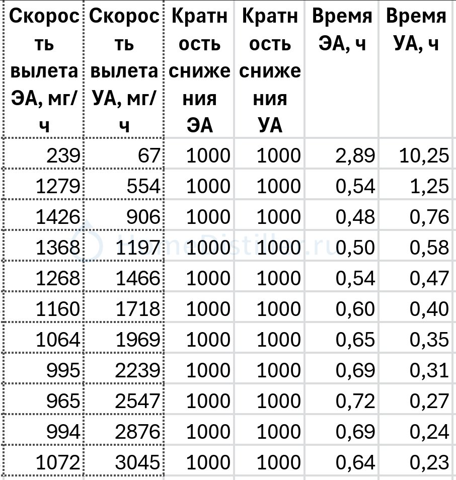 Естественно. Текущая таблица вообще не рассматривает время вывода, это буквально функция расхода по концентрации и мощности. Я другого и не анонсировал. По времени выхода и прочему будет другая таблица. Или две))