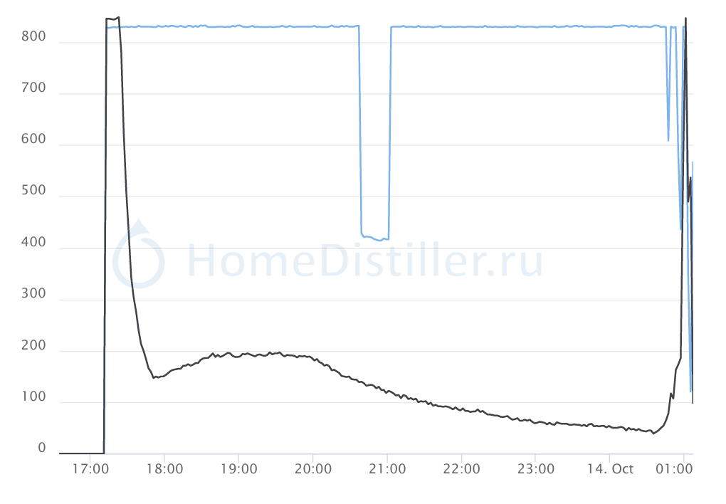 Показывает то он корректно, смещения нуля там в принципе быть не может (трансформаторная развязка). А вот абсолютные значения проводимости (надеюсь на максимальной чувствительности), ну очень не приглядны. Полагаю: 1. Или параллельно ДП имеет место быть дополнительное сопротивление (грязная пайка в разъёмах, плохая изоляция, провод НЕ ДОЛЖЕН быть экранированным). При сухом ДП сопротивление всей цепи должно значительно больше 20 МОм. 2. Спирт у тебя плохого качества (проводимость 50-200 попугаев). 2025-10-15_06-35-14. Измерение проводимости дистиллята для контроля окончания голов. Приборы и электр(он)ика. У меня на такой же автоматике ХД (АЦП 1024 ед) в первых экспериментах проводимость тела на ректе СС была 15 ед и ниже. [сообщение #13938808] На ректе крепкой навалки от 6 ед и ниже.