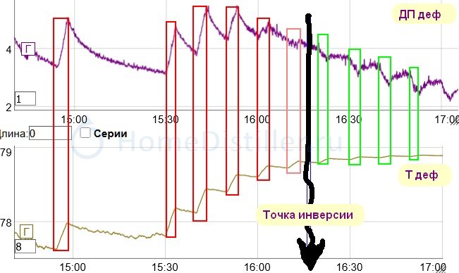 смотри: точка инверсии. Измерение проводимости дистиллята для контроля окончания голов. Приборы и электр(он)ика. выделенное квадратиками - это открыт клапан отбора голов. Температура и до и после точки инверсии ведет себя как ей и положено - отбор голов открыт - Т растет. А вот проводимость до точки инверсии ведет себя совершенно неподобающе - вместо того чтоб падать при сливе голов, она растет