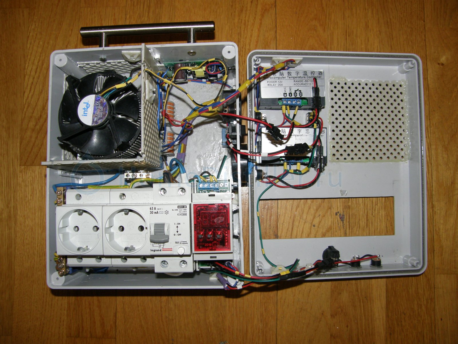 Twilight, Корпус сборки из типовой электрической распредкоробки. На выдув, вдув сбоку. Решётка вырезана из корпуса старого монитора. Охлаждение симистора РМВК. PB122635. Старт стоп на буржуйском термоконтролере . Автоматика.