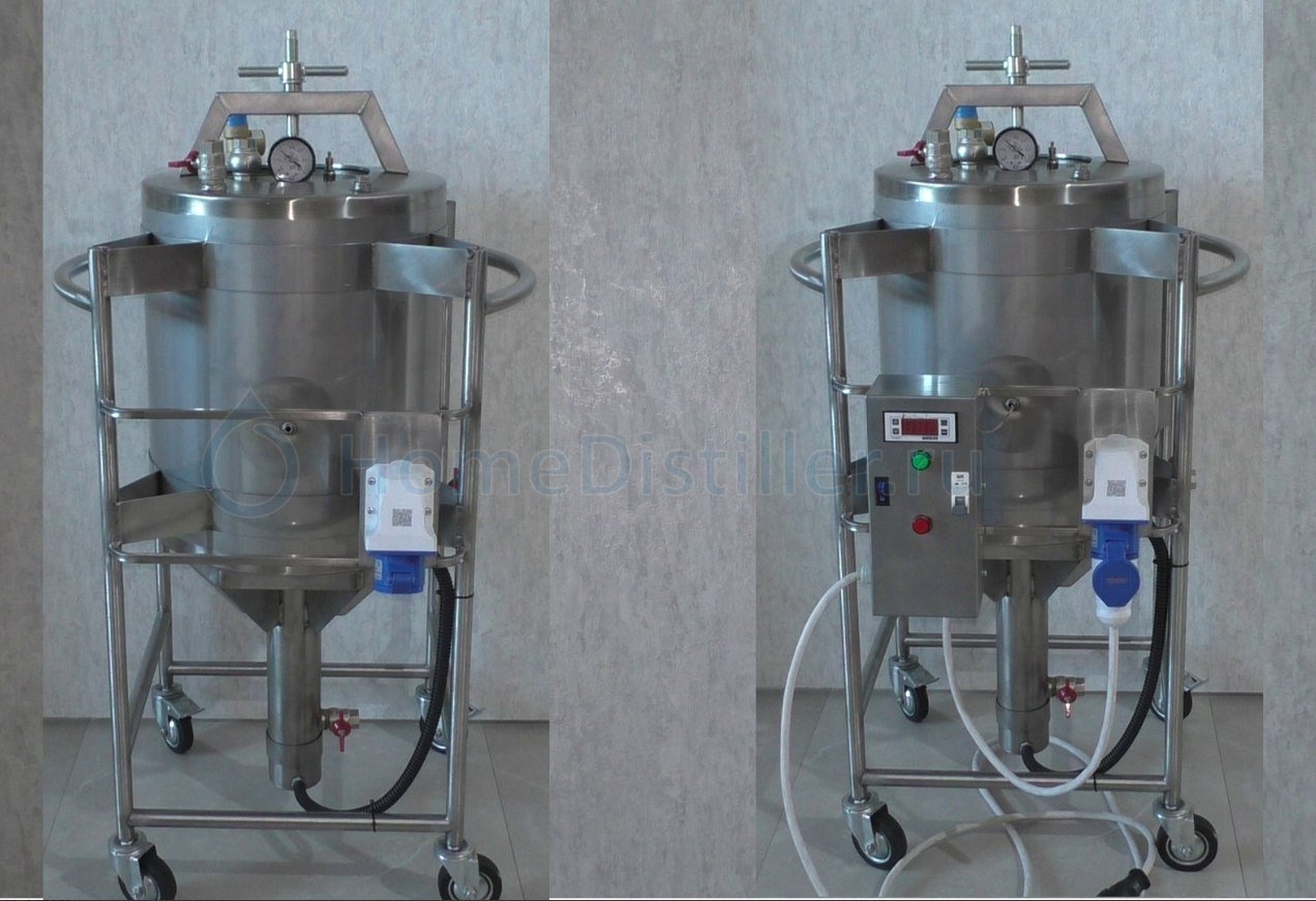 Хотелось бы иметь аппарат что катается, но тогда раза в два больше и с увеличителем. С электро прямым нагревом воды элекронагревателем. С рубашкой охлаждения и кучей кранов...Так вот же твоя мечта,пятью постами выше.