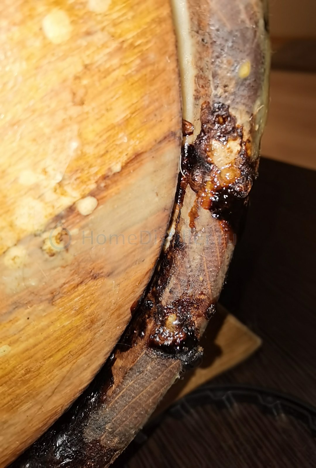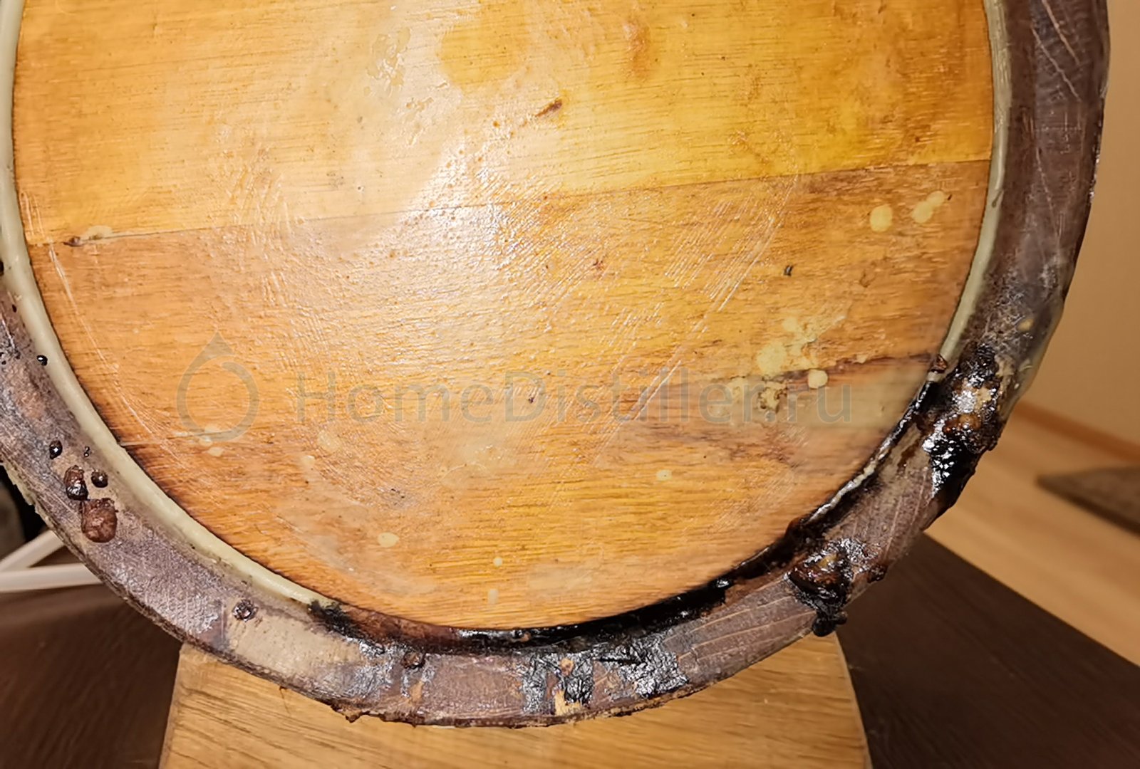 Коллеги, не знаю точно в какую тему писать, придется написать тут. Попалась мне маленькая пятилитровая новая дубовая бочка. Понимаю, что это баловство, но решил на ней ставить эксперименты, руки чешутся, поэтому я каждую клепку пронумеровал, донца разметил и аккуратно снял три обруча из четырех и вытащил одно донце. Хочу обжечь бочку изнутри. Но вот увидел в пазу в которое вставляется донце что-то вроде замазки по всей окружности. Можете пояснить? Это всегда так делают? Кладут замазку? Или только в некачественных бочках?