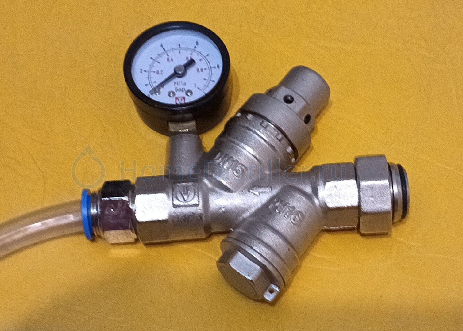 Итак, вот фото двух новых регуляторов, точнее стабилизаторов, напора охлаждения. Первый вариант с использованием редуктора газового баллона, второй со штатным, для водопровода. Регулятор напора охлаждения колонны 1. БКМ -ТРУБА -42 ИЛИ УНИВЕРСАЛЬНАЯ КОЛОННА ,. Оборудование для перегонки и ректификации. Первый состоит из баллонного вентиля ВБ-2, белорусского производства, на коническую резьбу которого завёрнута гайка 3/4, с переходом на 1/2, в которую, в свою очередь, вкручен переходник на кухонный кран с 1/2 на метрическую М24х1. Как оказалось, практически гайка 3/4 отлично накручивается на коническую резьбу вентиля и хорошо держится. В качестве герметизирующей прокладки использовал обычный лён, даже без герметика. Ну а редуктор Дока (производства Китай) привинчен на своё штатное место. Там левая резьба СП 21,8. Снимаем рассекатель с крана и привинчивает вместо него вот этот регулятор. Тест в течении часа показал довольно стабильный напор воды на реальной колонне. Напомню, верхняя точка, откуда вода их дефлегматора уже стекает в раковину находится на высоте 1,3 метра, относительно кухонного крана. Давление оказалось достаточным для "продавливания" воды по системе трубок колонны. На фото слева внизу хорошо видна тоненькая струйка из наконечника авторучки, для визуального контроля напора. Должен сказать, что регулировка воды с использованием редуктора для газового баллона мне не понравилась, хотя, можно сказать, что она достаточно плавная. Фишка в том, что стабилизация происходит (а она действительно происходит) как-бы внезапно, непредсказуемо, что-ли. Каждый раз "ловить" нужно. Но, в любом случае, этот стабилизатор реально помогает. Поскольку такой конструкции я нигде не видел, решил с Вами поделиться. На втором фото другой стабилизатор напора, уже с использованием штатного редуктора для воды VRT-4200-000015. Он имеет регулировку выходного напора от 0,5 до 6,0 бар. Для моей работы устанавливаем его на минимум, т.е. внутреннюю регулировочную пружину НЕ зажимаем (у меня регулировка винтом под отвёртку). Тут всё проще. Открываем кухонный кран как хочется, а сработка происходит лишь при открывании точного крана, т.е. при включении охлаждения колонны. Открываем его вначале сильно, раздаётся звук - "дук", думаю что так срабатывает клапан, и уже после этого уменьшаем напор до нужного уровня, он уже стабилизирован регулятором. Редуктор давления. БКМ -ТРУБА -42 ИЛИ УНИВЕРСАЛЬНАЯ КОЛОННА ,. Оборудование для перегонки и ректификации. Точный кран с чёрной ручкой от газовой колонки Bosch, лет 100 ему. Чёрный шнурок, это крепление "гусака" к ручке кухонного шкафа, расположенного над мойкой, так как сам регулятор получился достаточно увесистым. Струйка тоже видна в нижнем левом углу.
