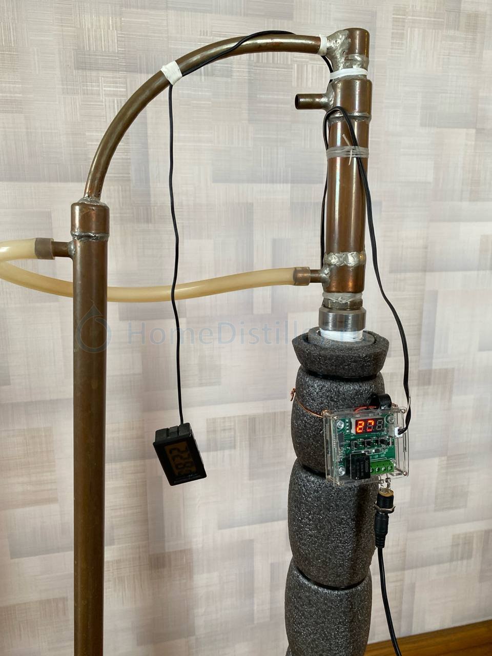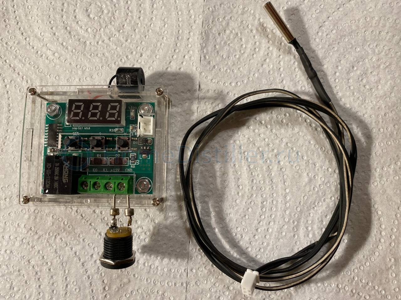 Привет! Нет, пищалка сверху, над цифровым табло. Провода от пищалки идут к разъёму, но сзади платы и подпаяны к нему снизу. Я не собираюсь её прикручивать каждый раз к разъёму, поэтому приклеил и подпаял на постоянное место. Приклеена она к штатному корпусу (продаётся отдельно на маркетплейсах, стоит порядка 200р) из оргстекла клеевым пистолетом. Толщина корпуса 15мм и пищалка там легко поместилась. Если внимательно присмотритесь, то там даже проводки видны, один чёрный, другой красный. Разъём питания ("мама") снизу корпуса термостата, к нему подпаяны жёсткие выводы от СВЧ аппаратуры (просто у меня были, можно любые подходящие), а с другой стороны эти выводы просто прикручены к соединительной колодке, установленной на плате, её штатными винтами. На фото в моём предыдущем посте хорошо видно. Так сказать, временный вариант, но достаточно жёстко держится. Может и не буду менять. На фото термостат на колонне с подключенным разъёмом ("папа") от блока питания. Термостат на колонне. БКМ -ТРУБА -42 ИЛИ УНИВЕРСАЛЬНАЯ КОЛОННА ,. Оборудование для перегонки и ректификации. Фотографировал напротив окна, что бы лучше видно было, однако цифры не все получились. На самом деле они видны прекрасно, светятся красным цветом. В данный момент времени термометр показывает температуру в комнате +22,2С. Рядом висит старый термометр без сигнализатора. Не стал его пока демонтировать, спешить некуда.