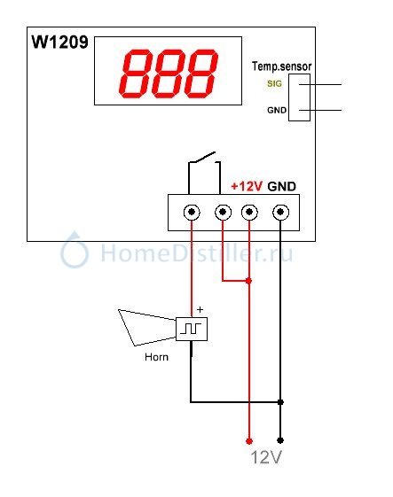 Друзья, Вашему вниманию предлагается устройство контроля температуры, с точностью до 0,1 градуса, которое выдаёт звуковой сигнал при достижении заданного значения. Для этого применён термостат W1209. Это уже "народный" гаджет, опробованный тысячами людей в разных местах, с неизменно положительным результатом. Более того, цена изделия просто смешная, меньше 200 рублей. Ссылку не даю, так как по истечении времени она может пропасть, а аналогичный товар можно купить во многих местах. На первом фото я показываю, как выглядит плата устройства в общем виде. Кроме этого, я заказал штатный корпус из оргстекла (заказывается так же, по поиску - корпус для термостата W1209), так как с ним удобнее и монтировать плату, да и вообще, практически закрепить его в удобном месте. Кому жалко 200 рублей, можно применить любой подходящий корпус из пластика. На фото сама плата в штатном корпусе и датчик температуры (он в комплекте), который закрепляется в 20-25см выше куба просто примоткой лентой ФУМ к царге. В оригинале, провод короткий (30см) и его нужно удлинить. Ничего страшного, применяйте без опаски провод до 2х метров длиной. В принципе, можно и 10м, но тогда нужно будет измерить его сопротивление (чем меньше, тем лучше), дабы сопротивление провода не влияло на показания устройства. Термостат 1209 с датчиком. БКМ -ТРУБА -42 ИЛИ УНИВЕРСАЛЬНАЯ КОЛОННА ,. Оборудование для перегонки и ректификации. На фото, кроме самой платы в корпусе, Вы видите какие-то две детали, которых нет в комплекте при покупке. Одна сверху, вторая снизу, обе чёрного цвета, выходящие за габариты платы. Снизу, это разъём для подключения блока питания. Нужно 12 вольт постоянного напряжения. Тут, как вам удобно, можно даже просто, без разъёма, присоединить к колодке провода от блока питания, но тогда вы будете вынуждены "таскать" его вместе с колонной. А вот сверху установлен автомобильный сигнал поворота, или заднего хода, или открытой двери и т.д., в общем, фитюлька, которая пищит при подаче на неё 12 вольт. Она малюсенькая, но пищит будь здоров. Приклеена клеевым пистолетом. Можно хоть скотчем примотать. Ссылку не даю, набираете в поиске сигнал звуковой автомобильный. Где хотите, там и покупаете. Схема подключения ниже. Схема поключения пищалки на W1209. БКМ -ТРУБА -42 ИЛИ УНИВЕРСАЛЬНАЯ КОЛОННА ,. Оборудование для перегонки и ректификации. Таким образом, мы имеем некое защитное устройство (сигнализатор) от пропадания напора охлаждения, плюс, если всё нормально, устройство, отслеживающее дельту с точностью до 0,1С. Как только температура превысит установленное Вами значение, раздаётся громкий сигнал, мол, товарищ, будь любезен подойти к колонне и произвести нужные манипуляции. Пищит, я вам доложу так, что кошка моя сбежала в соседнюю комнату и спряталась там. Есть некоторые особенности настройки, про которые вы можете прочитать на любом сайте, посвящённом устройству контроллера W1209. Подскажу, заводская настройка гистерезиса 2 градуса, а вам нужно настроить 0,1, что прибор позволяет, ничего сложного. Ну и в заключении привожу чертёж колонны, так как раньше я его не выкладывал. Колонна-0000. БКМ -ТРУБА -42 ИЛИ УНИВЕРСАЛЬНАЯ КОЛОННА ,. Оборудование для перегонки и ректификации.