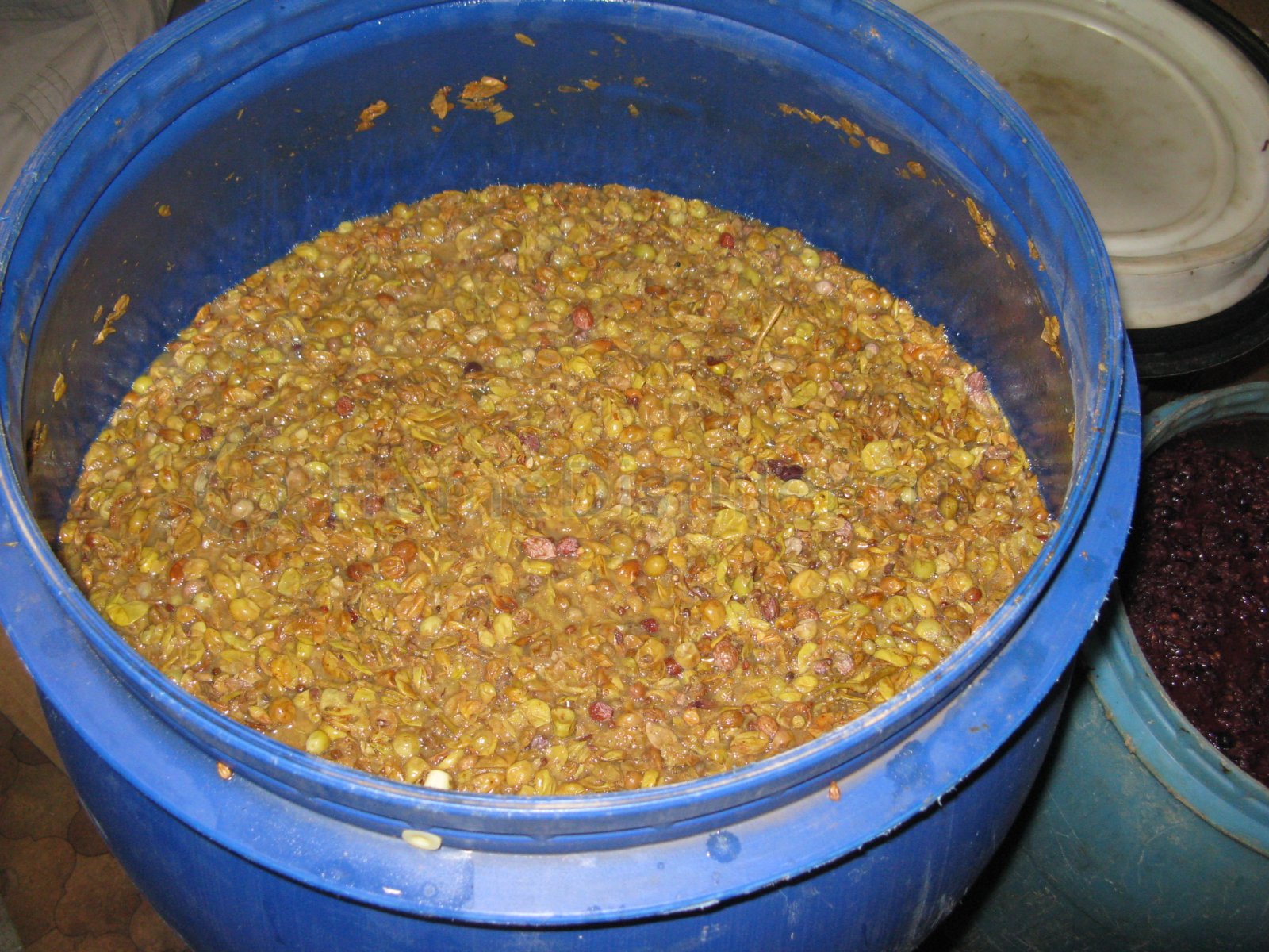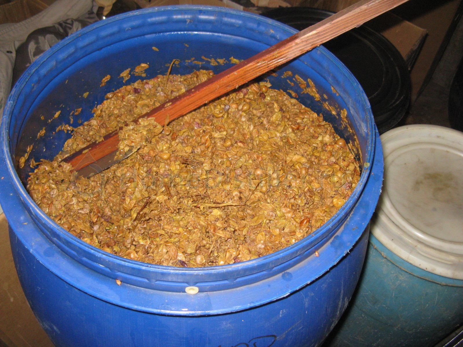 монтер, "загорелые" ягодки это не порченые случаем?Камень, 01 Окт. 25, 19:25Да ну, нормальный виноград, пахнет свежо. Насчет перчаток тут сомневались, вот так они работают. Вот бочка с мезгой, уже "шапка" из нею не вылазит, но еще довольно плотная и перемешал. Красный сбоку на "выхлоп", да и этот на выходной тоже.